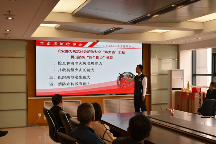 首先進行的是消防安全知識講座。本次講座,公司特邀河南省消防協會孫鴻運宣講員到公司進行消防安全知識培訓。講座中,孫宣講員從如何檢查消除安全隱患、正確報告火警、撲救初期火災和火場逃生等方面進行了生動細致的講解。此外,結合近年來真實發生的火災案例,通過一張張觸目驚心的圖片、一段段引人深思的視頻,讓大家深刻感受到火災的無情和消防知識的重要性。孫宣講員還對滅火器、滅火毯、防毒面具等常用消防器材的使用方法一一做了展示和指導。